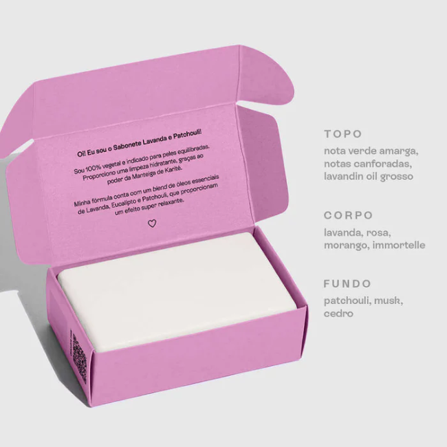 Possui Manteiga de Karité que é super nutritiva, rica em vitaminas e ácidos graxos, ajuda a hidratar, restaurar e proteger a barreira da pele. A Glicerina é umectante natural que atrai e retém a umidade da pele, garantindo maciez, viço e sensação de hidratação após o banho. O óleo essencial de Lavanda acalma e suaviza a pele, o Patchouli traz um fundo terroso e relaxante, e o Eucalipto renova e refresca. Juntos, criam um banho aromático, equilibrado e reconfortante.