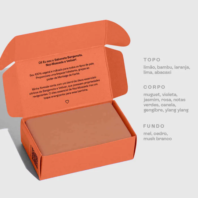Possui Manteiga de Karité que é super nutritiva, rica em vitaminas e ácidos graxos, ajuda a hidratar, restaurar e proteger a barreira da pele. A Glicerina é umectante natural que atrai e retém a umidade da pele, garantindo maciez, viço e sensação de hidratação após o banho. A Bergamota refresca e revigora, a Noz-Moscada traz calor e suavidade e o Vetiver acrescenta profundidade terrosa, criando um aroma equilibrado e aconchegante.